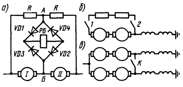 В случае боксования колесной пары с двигателем II ток пойдет через диод VD1, обмотку реле РБ, диод VD2. Мостовая схема обеспечивает в том и другом случае прохождение тока по катушке реле в одном и том же направлении. Поэтому реле не размагничивается и не изменяется его уставка. Резисторы R ограничивают ток, проходящий через обмотку реле.