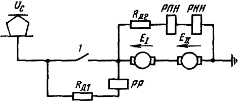 Реле РР включают таким образом (рис. 103), что если суммарная э. д. с. тяговых двигателей значительно отличается от напряжения контактной сети, через его обмотку проходит ток и якорь реле притянут к сердечнику. Контакт 1, введенный в цепь тяговых двигателей, разомкнут. Машинист, перемещая тормозную рукоятку контроллера, изменяет э. д. с. тяговых двигателей. Когда разница между нею и напряжением контактной сети составит 80—100 В, якорь реле отпадет, контакт 1 замкнется. Резистор ограничивает ток в цепи реле.