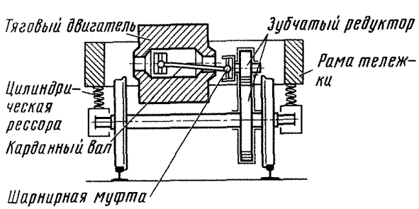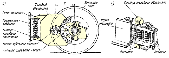 Поскольку тяговый двигатель полностью подрессорен, а колесная пара неподрессорена, он не может быть непосредственно связан с ней зубчатой передачей. В этом случае связь тягового двигателя с колесной парой осуществляется с помощью полого вала двигателя, карданной (торсионной) передачи или шарнирных муфт.