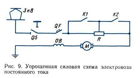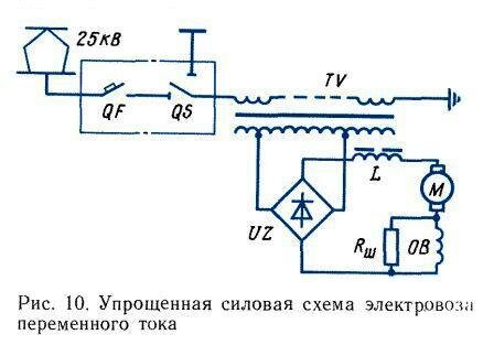 Простейшее изображение силовой цепи электровоза постоянного тока приведено на рис. 9, электровоза переменного тока — на рис. 10. Эти очень упрощенные схемы силовых цепей выполнены с использованием условных графических и буквенных обозначений, предусмотренных соответствующими стандартами.