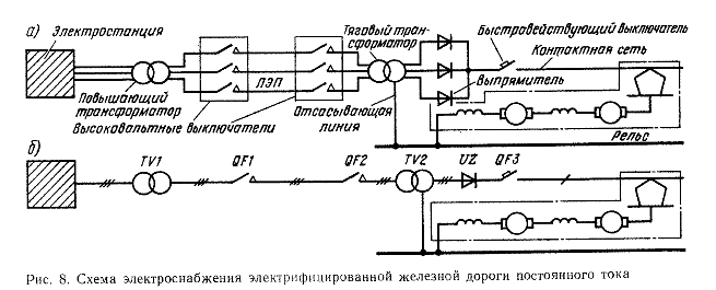 Схема дает наглядное представление об электрических связях и оборудовании системы электроснабжения электрифицированной железной дороги постоянного тока. При этом на рис. 8, а даны полные названия элементов, показанных на рис. 2, для более четкого понимания их условных графических изображений. На рис. 8, б применены условные обозначения элементов в соответствии с ГОСТ 2.710—81.