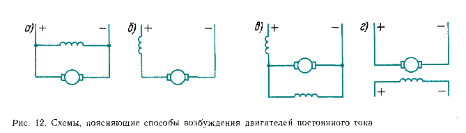 Обмотка возбуждения может быть включена параллельно обмотке якоря (рис. 12, а) и последовательно с ней (рис. 12, б). Такие двигатели называют соответственно двигателями параллельного и последовательного возбуждения. Используют также двигатели, у которых имеются две обмотки возбуждения — параллельная и последовательная. Их называют двигателями смешанного возбуждения (рис. 12, в). Если обмотки возбуждения включены согласно, т. е. создаваемые ими магнитные потоки складываются, то такие двигатели называют двигателями согласного возбуждения; если потоки вычитаются, то имеем двигатели встречного возбуждения. Применяют и независимое возбуждение: обмотка возбуждения питается от автономного (независимого) источника энергии (рис. 12, г).