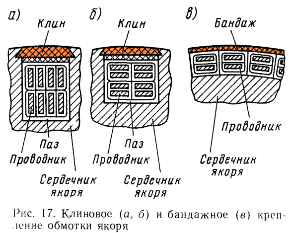 Уложенную обмотку необходимо закрепить в пазах, иначе при вращении якоря она под действием центробежной силы будет вырвана из пазов. Закрепить ее можно, либо наложив бандаж на цилиндрическую поверхность якоря, либо поставив клинья в пазы (рис. 17, а, б).