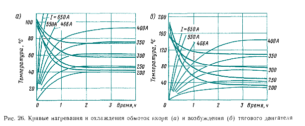 Для примера на рис. 26 показаны кривые нагревания и охлаждения обмотки якоря и обмоток главных полюсов тягового двигателя ТЛ-2К1 в зависимости от тока.