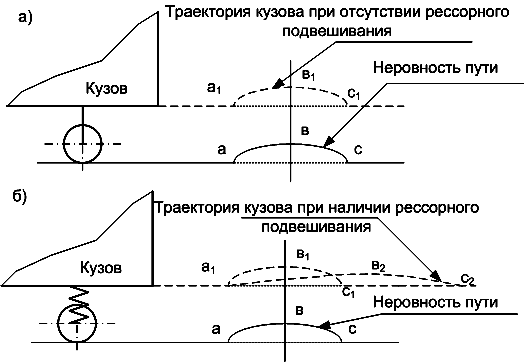 Смягчающее действие рессорного подвешивания при передаче кузову толчков рассмотрим на примере движения вагона по рельсовому пути. При качении колеса вагона по рельсовому пути из-за неровности рельса и дефектов поверхности катания колеса кузов вагона, при безрессорном соединении его с колёсными парами будет копировать траекторию движения колеса (рис.а). Траектория движения кузова вагона (линия а1-в1-с1) совпадает с неровностью пути (линия а-в-с). При наличии рессорного подвешивания вертикальные толчки (рис.б) передаются кузову через упругие элементы, которые, смягчая и частично поглощая толчки, обеспечивают более спокойный и плавный ход вагона, предохраняют подвижной состав и путь от преждевременного износа и повреждений. Траекторию движения кузова при этом можно изобразить линией а1-в2-с2, которая имеет более пологий вид по сравнению с линией а в с. Как видно из рис. б, период колебаний кузова на рессорах во много раз больше, чем период изменения возмущающей силы. Вследствие этого уменьшаются ускорения и силы, воспринимаемые кузовом.