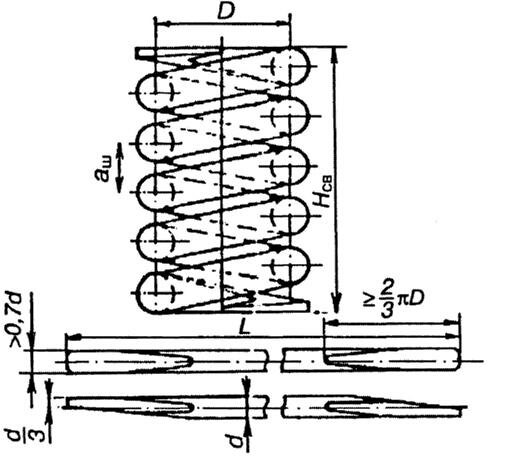 Пружины изготавливают в соответствии с ГОСТ 14959. Опорные поверхности пружин делают плоскими и перпендикулярными к оси. Для этого концы заготовки пружины оттягиваются на 1/3 длины окружности витка. В результате этого достигается плавный переход от круглого к прямоугольному сечению. Высота оттянутого конца пружины должна быть не более 1/3 диаметра прутка d, а ширина — не менее 0,7d.