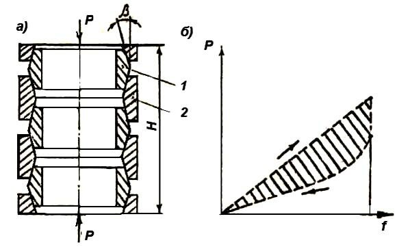 Величина работы сил трения между кольцами (рис. б), совершаемая при загружении рессоры, зависит от точности их изготовления и наличия смазки. Смазка применяется для обеспечения стабильного трения при отсутствии заклинивания.