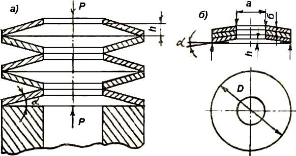 Как видно из рисунка, тарельчатые рессоры состоят из упругих элементов, имеющих вид усечённого конуса с углом подъёма и внутренней высотой, соединённых попарно (рис. а) в секции так, чтобы они соприкасались точно по периметру (внутренняя и наружная кромки совпадают). Возможен и другой вариант сборки рессоры (рис. б), когда тарелки рессоры накладываются одна на другую. В результате действия силы стенки тарелок изгибаются, и угол подъёма уменьшается.
