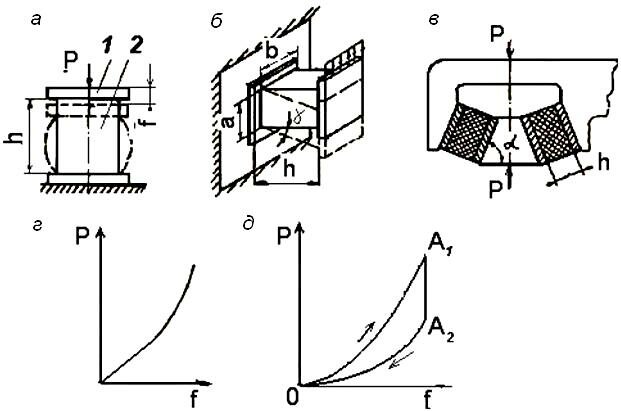 Резиновые рессоры и их силовые характеристики: а – рессора,