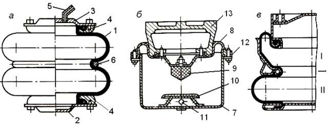 Пневморессоры смешанного типа (рис. в) имеют диафрагменную часть I и баллонную часть II.