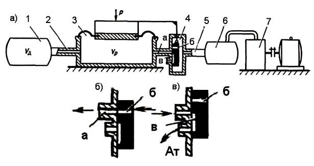 а – общая схема; б – положение золотника при повышении нагрузки; в – положение золотника при уменьшении нагрузки; 1 – дополнительный резервуар; 2 – дроссель; 3 – пневморессора; 4 – регулятор положения кузова; 5 – трубопровод; 6 – главный резервуар; 7 – компрессор; а – канал к пневморессоре; б – канал в золотнике; в – выемка в золотнике