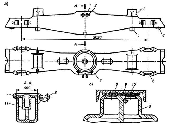 Данную анимированную картинку мы включили для общего представления о боковой раме, хотя, заметим, она сделана не вполне точно. Не показаны бонки для пружин в нижней части рессорного проема; направляющие для фрикционных клиньев; не очень правильно изображены буксовые проемы рамы На рисунке - боковая рама с внутренней стороны. Показаны буксы, пружины рессорного комплекта, подвески для тормозных башмаков Надрессорная балка (рис. а) отлита из стали 20ГЛ или 20Г1ФЛ в виде бруса равного сопротивления изгибу замкнутого коробчатого сечения. Она имеет подпятник 7, полку 7 для крепления кронштейна 2 мертвой точки рычажной передачи тормоза, опоры 3 для скользунов, выемки (гнезда) 6 для размещения фрикционных клиньев, бурты 5, ограничивающие смещение внутренних пружин рессорного комплекта, и выступы 4, удерживающие наружные пружины от смещения при движении тележки.