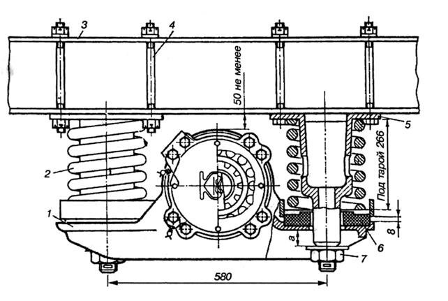 Рисунок - Рама тележки КВЗ-И2 Буксовое подвешивание включает две однорядные пружины 2, которые через резиновые шайбы 6 опираются на кронштейны 1 буксы, поддерживая раму тележки. Для дополнительной связи букс с рамой тележки в буксовом подвешивании используются стальные литые шпинтоны 5. Каждый шпинтон крепится к продольной балке 3 рамы тележки при помощи четырех болтов 4. На нарезную часть шпинтона навертывается гайка 7 так, что между шайбой и кронштейном буксы остается зазор а.