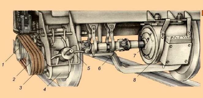 1 — ведущий шкив; 2 — ведомый шкив, 3 — четыре приводных ремня; 4 — редуктор; 5 — натяжное устройство; 6 — карданный вал; 7 — генератор; 8 — предохранительное устройство