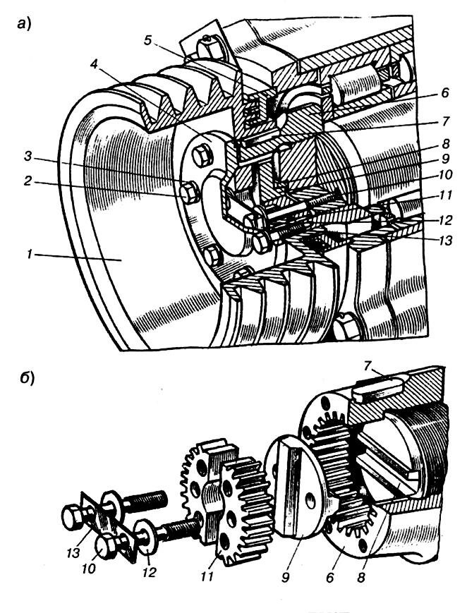 Ведущий шкив (рис.2, а) представляет собой литой цилиндр 1, на поверхности которого имеются четыре канавки для размещения клиновых ремней. Средняя торцовая часть шкива выполнена в виде втулки с лабиринтовыми канавками, которые входят в лабиринты крепительной крышки 5. Шкив на торце оси крепится при помощи зубчатой гайки б, призматической шпонки 7, клиньев 5, крестовины 9, болтов 10, двух зубчатых секторов 11, тарельчатых пружин 12 и стопорной пластины 13. Болты 10 ввертывают в торец зубчатых секторов 77.