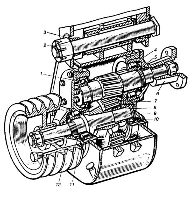 Ведомый шкив 12 (рис. 3) привода кроится па конусную часть вала 8 редуктора, корпус 9 которого сварной, Внутри его размещены валы 8 и 5 с большим 7 и малым зубчатыми колесами, предназначенными для изменения частоты вращения ведомого вала. Вал 5 изготовлен заодно целое с малым зубчатым колесом, а на валу 8 надето большое зубчатое колесо 7. Валы вращаются в подшипниках 1, 4 и 10, 11. На валу 5 закреплена муфта 6, с помощью которой редуктор соединяется с карданным валом, передающим вращение генератору. Редуктор подвешен к кронштейнам рамы тележки шарнирно с помощью вала 2, размещаемою во втулках 3. Шарнирная подвеска редуктора позволяет производить натяжение ремней с помощью специального устройства
