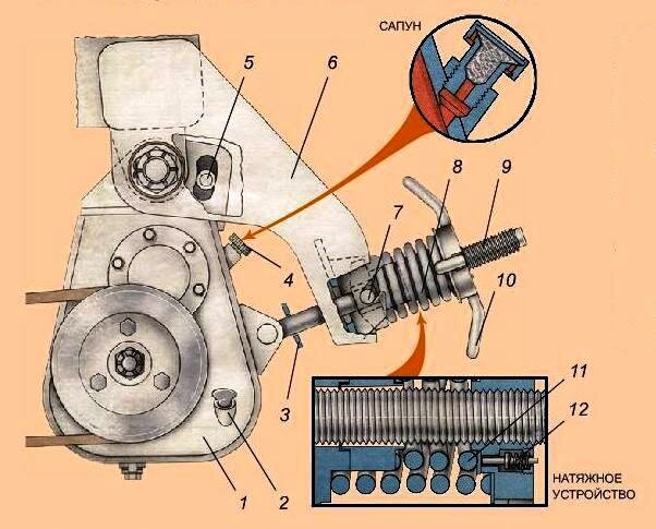 Передача вращающего момента с ведущего шкива на ведомый производится при помощи ремней. В приводе используется четыре клиновых ремня типа В2360Т. Их натяжение 315 - 330 кг обеспечивается натяжным приспособлением и массой редуктора. Регулировка натяжения осуществляется путем сжатия пружины при помощи рычажной гайки.