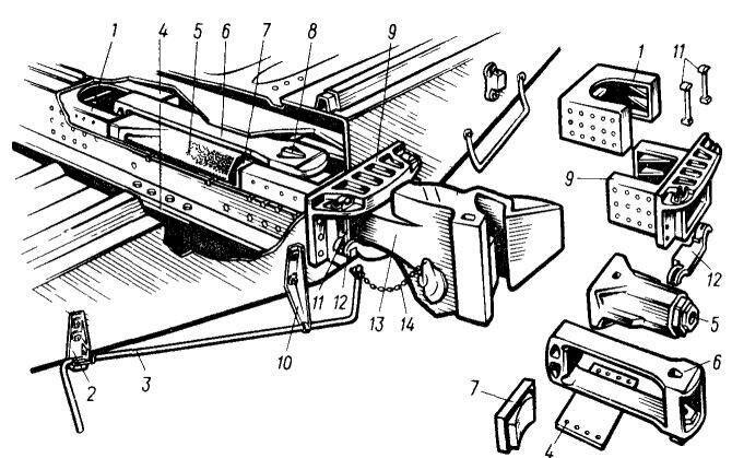 Центрирующий прибор, состоящий из двух маятниковых подвесок 7 и центрирующей балочки 12, возвращает автосцепку после бокового отклонения в центральное положение. Расцепной привод служит для расцепления автосцепок. Он состоит из расцепного рычага 3, цепи 14 и поддерживающих деталей — кронштейнов фиксирующего 2 и поддерживающего 10, укрепленных на концевой балке. Поддерживающая планка 4 удерживает автосцепку в горизонтальном положении и на определенной высоте, предусмотренной установочным чертежом.