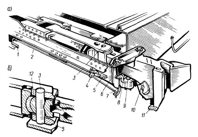В автосцепном устройстве восьмиосных вагонов (рис. 2, а) соединение автосцепки с тяговым хомутом выполнено посредством цилиндрического валика 3. Между валиком и автосцепкой находится вкладыш 12 (рис. 2, б) . Валик удерживается от выпадания с помощью планки 5, проходящей через отверстия в переднем упоре 6. Автосцепка 10 (см. рис. 2, а) восьмиосного вагона является полужесткой, так как имеет ограничитель 11, препятствующий разъединению автосцепок при их больших относительных перемещениях. В центрирующем приборе находится подвижная плита 8 с направляющими, опирающаяся на пружины 9. Для обеспечения сцепляемости восьмиосных вагонов в кривых участках пути небольшого радиуса эти вагоны оборудуются направляющим механизмом, состоящим из торсиона 2 (П-образного рычага из пружинной стали), укрепленного во втулках 4.