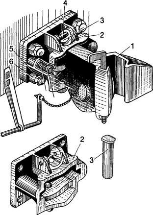 У автосцепного устройства паровозного типа (рис. 3) нет поглощающего аппарата и связанных с ним деталей. Паровозная розетка 2, предназначенная для передачи усилий от автосцепки 1 на раму подвижного состава, закреплена на концевой балке болтами 5 с гайками 6 и шплинтами.