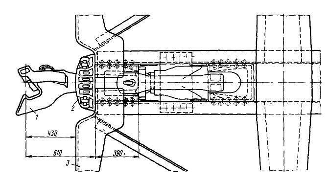 Автосцепное устройство на тепловозах и электровозах устанавливается так же, как и на вагонах, в соответствии с ГОСТ 3475-81. На электровозах серий ВЛ22, ВЛ23, ВЛ8 оно располагается на раме тележки (рис. 7), так как разместить автосцепку, чтобы продольная ось ее находилась на нужной высоте от уровня головок рельсов на главной раме электровозов этих типов, не представляется возможным. Автосцепка — серийная, типа СА-3 Стальная литая рама 1 тележки электровоза в передней части имеет специальный карман 2, в котором размещается поглощающий аппарат Передние опорные поверхности в кармане для поглощающего аппарата и упорной плиты расположены от передней плоскости концевой балки рамы тележки на расстоянии 390 мм. Между передними и задними упорами кармана расстояние сохранено равным 625 мм Ударная розетка 3 с маятниковым центрирующим устройством укрепляется на концевой балке рамы тележки сваркой или шестью болтами с гайками