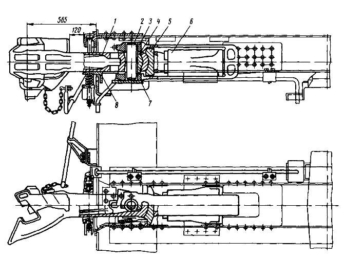 На восьмиосных вагонах устанавливается модернизированное автосцепное устройство (СА-ЗМ) (рис. 5), в котором расстояние от упора головы автосцепки до розетки составляет 120 мм. Это вызвано применением поглощающего аппарата 6, который может сжиматься на этот размер. Расстояние от оси зацепления до концевой балки составляет 565 мм. Центрирующий прибор имеет подпружиненную опору 8 для хвостовика автосцепки, который соединяется с тяговым хомутом 3 валиком 2. Для обеспечения вертикальных отклонений автосцепки устанавливается вкладыш 4. Кроме того, поверхность упорной плиты 5, соприкасающаяся с автосцепкой, выполнена в виде сферы. Плита 7 предохраняет валик от выпадания.