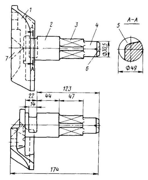 Балансир 1, соединяемый с цепью расцепного привода, облегчает возвращение валика подъемника в исходное положение после разведения автосцепок и в других случаях. Стержень валика состоит из толстой 2, тонкой 4 цилиндрических и квадратной 3 частей. В собранной автосцепке цилиндрические части располагаются в соответствующих отверстиях корпуса, а квадратная часть находится в отверстии подъемника Толстая цилиндрическая часть удерживает замок от выпадания, имеющаяся на ней выемка 5 предназначена для запорного болта. Конические углубления 7 на балансире и 6 на торце стержня служат для центровки валика подъемника на станке при обработке поверхностей стержня во время ремонта.