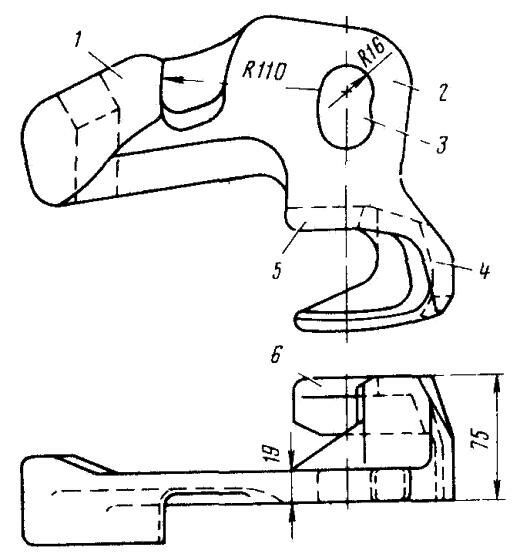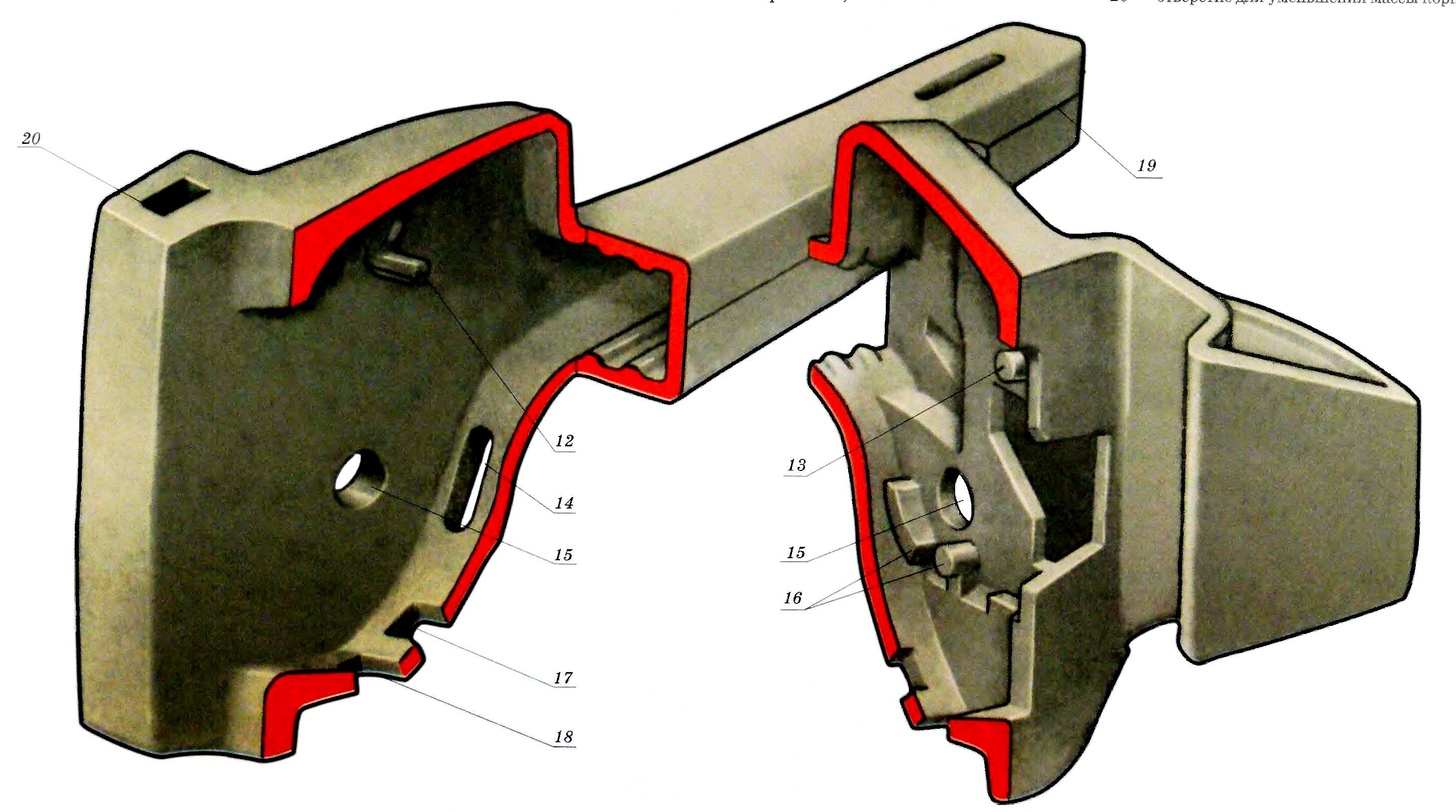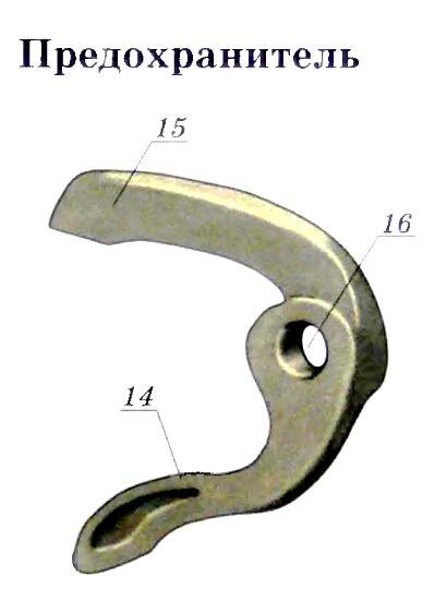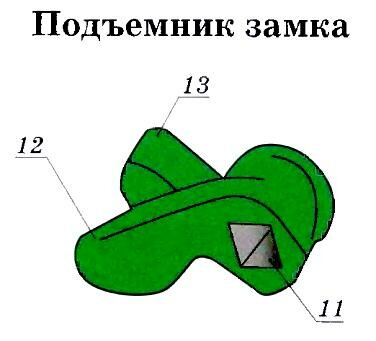 Серповидный прилив (рис. 5) вверху на внутренней стенке малого зуба ограничивает перемещение замка внутрь кармана. Нижняя часть прилива переходит в полочку 12, на которую опирается верхнее плечо предохранителя. В стенке корпуса со стороны малого зуба имеется отверстие 15 с приливом снаружи для размещения толстой цилиндрической части стержня валика подъемника, а со стороны большого зуба — отверстие 15 для тонкой цилиндрической части стержня. Рядом с этим отверстием находятся приливы 16, которые служат опорами для подъемника, а выше — шип 13 для навешивания замкодержателя.