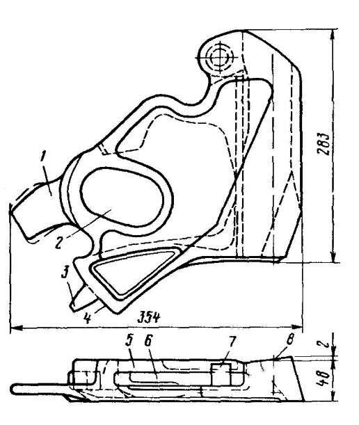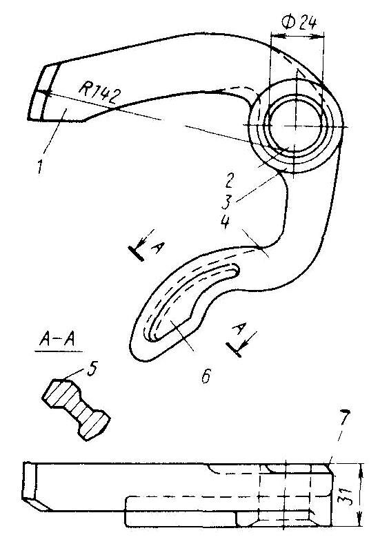 Чтобы предупредить излом нижнего плеча от действия инерционной нагрузки, в нем предусматривают углубления 6, уменьшающие его массу. Предохранитель делают штампованным и литым. Литой вариант предохранителя изготавливается из стали, имеющей высокий предел выносливости.