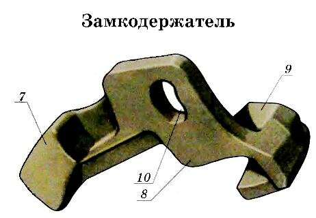 Замкодержатель (рис 7) вместе с предохранителем удерживает замок в нижнем положении при сцепленных автосцепках, а вместе с подъемником — в верхнем при расцепленных автосцепках до разведения вагонов
