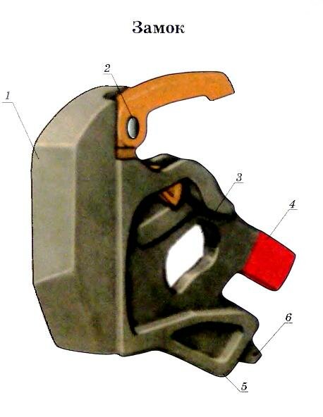 На цветной картинке обозначение частей замка другое: 1 - замыкающая (тяжелая) часть; 2 - шип для навешивания предохранителя; 3 -овальное отверстие; 4- сигнальный отросток; 5 - лпорная цилиндрическая поверхность; 6 -зуб