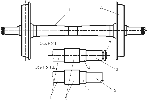 Рис. 1. Колесная пара и форма шейки оси: 1 - ось; 2 - колесо; 3 - шейка; 4 - предподступичная часть; 5 - подступичная часть; 6 - средняя часть; 7 - нарезная часть