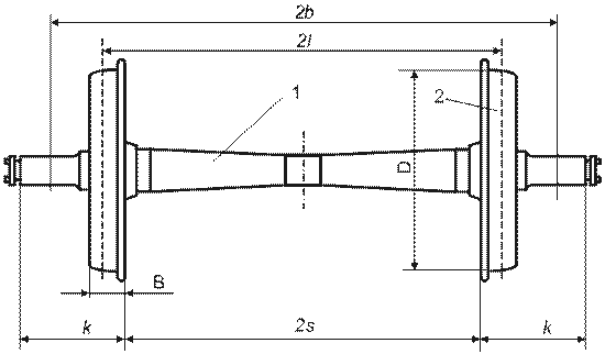 Для безопасного движения вагона по рельсовому пути на ось 1 прочно закрепляются колёса 2 (рис. 3) с соблюдением строго определённых размеров.Расстояние между внутренними гранями колёс 2s составляет: для новых колёсных пар, предназначенных для вагонов, обращающихся со скоростями до 120 км/ч – (1440±3), свыше 120, но не более 160 км/ч – (1440) мм. Номинальное расстояние между кругами катания колес 2l равно 1580 мм, а между серединами шеек 2b – 2036 мм.