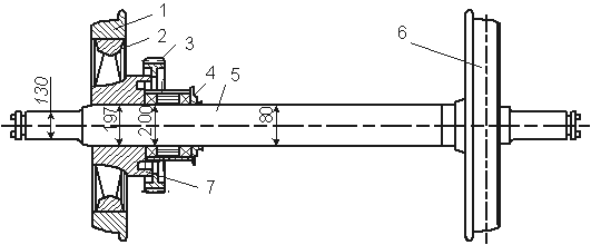 Диаметры шеек 3, (рис. 1), подступичной 5 и средней 6 частей оси определяют исходя из расчётной нагрузки. Предподступичная часть 4 является ступенью перехода от шейки к подступичной части оси и служит для установки уплотняющих устройств корпуса буксы. На nодступичных частях 5 прочно закрепляются колёса 2. На шейках 3 размещаются подшипники.