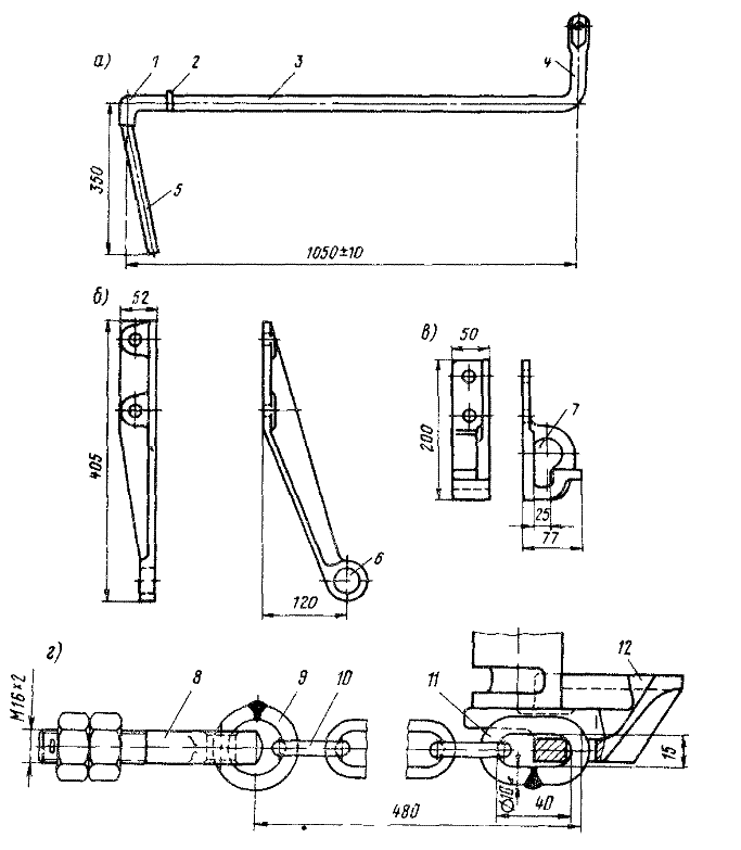 Фиксирующий кронштейн (рис. в) удерживает рычаг в расцепленном и нормальном положениях. В нормальном положении плоская часть расцепного рычага находится в прямоугольном пазу отверстия 7. Оба кронштейна закрепляются на подвижном составе болтами с гайками, контргайками и шплинтами.