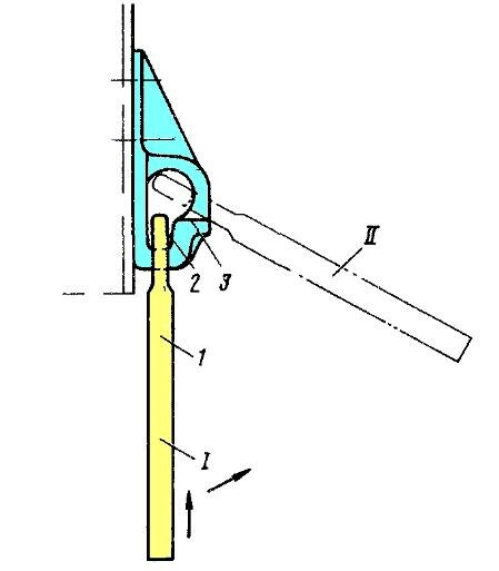 Чтобы удержать механизм автосцепки в выключенном состоянии (положение "на буфер"), рычаг поворачивают так же, как и для расцепления, а затем перемещают его по направлению стержня, пока рукоятка своей плоской частью не расположится на полочке 3 фиксирующего кронштейна в положение II. В этом случае расцепной привод будет удерживать замок в утопленном положении, следовательно, при соударении этой автосцепки с другой сцепления не произойдет.