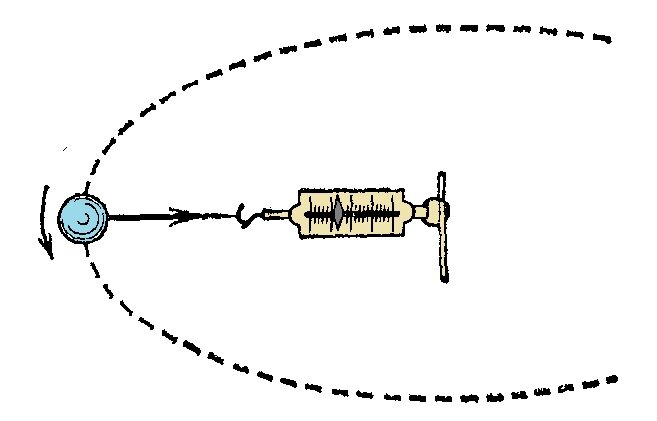 И мы знаем, что согласно второму закону Ньютона причиной ускорения является сила. Причиной любого ускорения, в том числе и центростремительного. Какая же это сила? Вот на рисуночке справа, показан динамометр, вставленный в ту верёвочку, на которой вращается шарик. Динамометр показывает какую-то силу, сколько-то Ньютонов. Это – сила натяжения нити. По природе – это сила упругости. Нить слегка растянулась, и её упругость (взаимодействие молекул нити) постоянно создает центростремительное ускорение, благодаря которому шарик имеет траекторию в форме окружности. Если бы нить оборвалась – шарик полетел бы по вектору скорости – по касательной.