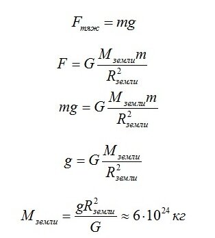 Генри Кавендиш с гордостью говорил: "Я взвесил Землю!" Он действительно сделал это. Для любого груза массой m с помощью динамометра нетрудно найти силу тяжести. Но сила тяжести - это и есть сила всемирного тяготения между этим грузом и Землёй. А расстояние между телами - в формуле подразумевается, что это расстояние между центрами этих тел - можно считать равным радиусу Земного шара. И вот что получается: