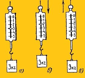 Вот на картинке показано, что гиря имевшая вес 3 кг при неподвижных весах, имеет вес 2 кг при движении весов вниз (б) и 4 кг при движении весов вверх. (Здесь, заметим, весы торговые, проградуированы в единицах массы; на самом деле вес, конечно, изменяется не в килограммах, а в Ньютонах).