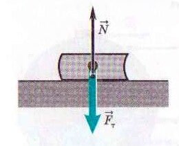 По природе своей сила нормальной реакции –это сила упругости. Молекулы, из которых сделана поверхность стола, сжимают, как пружину, сдвигают ближе друг к другу, чему они активно сопротивляются. Правда, в отличие от пружины, деформация стола очень мала, на глаз совершенно незаметна. И потому физики вводят в обиход условное понятие - АБСОЛЮТНО ТВЕРДОЕ ТЕЛО. Таковым в данном опыте является стол. Считают, что он совсем нисколько не деформируется, но при этом как пружина обладает силой упругости, в точности уравновешивающей силу тяжести.По направлению – сила N всегда перпендикулярна плоскости опоры. Перпендикуляр к плоскости опоры называется НОРМАЛЬ, поэтому данную силу называют НОРМАЛЬНОЙ. Аналогично вводят понятие АБСОЛЮТНО НЕРАСТЯЖИМОЙ НИТИ. Считается, что нить, на которой подвешан груз не деформируется, но тем не менее обладает силой упругости Т, которую так и называют СИЛА НАТЯЖЕНИЯ НИТИ.