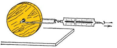Иначе говоря – зависит ли сила трения от площади трущихся тел? При том же самом весе кирпича. Нет, не зависит. Это немного странно, казалось бы, больше площадь – больше зацепляющихся неровностей… Но нет, тогда удельное нажатие на единицу площади станет меньше, и тела, получается, прижмутся не так крепко. Доказано – не зависит. Сила трения скольжения при движении (не трение покоя) существенно зависит от скорости. Жидкости и газы, как уже было сказано, не имеют трения покоя, то сопротивляются передвижению тел в этих средах. Трение для них так и называется – сопротивлением. Колеса, валики, подшипники серьёзно улучшают движения. Но и они обладают трением, так называемым трением качения. На картинке слева показано, как катящееся колёсико тянут через динамометр. Динамометр показывает не нуль, а какую-то силу. Следовательно – трение качения есть. Оно, конечно, значительно меньше, чем трение скольжения. Поэтому и говорят, что изобретение колеса стало гигантским скачком в прогрессе человечества.