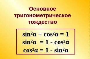 Само то тождество - которое в первой строчке. Синус в квадрате плюс косинус в квадрате этого же угла равно единице. Маленько похоже на теорему Пифагора. А снизу - видите - как бы следствия из этого тождества, которые помогают найти синус, если известен косинус, или найти косинус, если известен синус. Это как раз наш случай - есть косинус, нужен синус.
