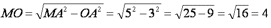 Еще мы знаем, вернее видим своими глазами, что осевое сечение конуса - это треугольник. А знаем, что площадь треугольника равна половине произведения основания на высоту. Основание нам известно, это АВ, которая составлена из двух радиусов, то есть равна 3 + 3 = 6.Высота МО неизвестна, но из прямоугольного треугольника АМО её можно найти по теореме Пифагора.