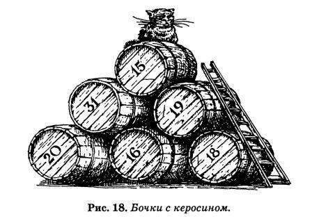 В магазин доставили 6 бочек керосина. На рис. 18 обозначено, сколько ведер было в каждой бочке. В первый же день нашлось два покупателя; один купил целиком две бочки, другой -три, причем первый купил вдвое меньше керосина, чем второй. Так что не пришлось даже раскупоривать бочек.