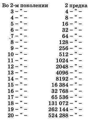 Каждый из моих двух дедов и каждая из моих двух бабушек также имели отца и мать. Следовательно, в 4-м поколении у меня 8 прямых предков. Восходя к 5-му, 6-му, 7-му и т. д. поколениям я нахожу, что число моих предков все возрастает и притом чрезвычайно заметно, именно: