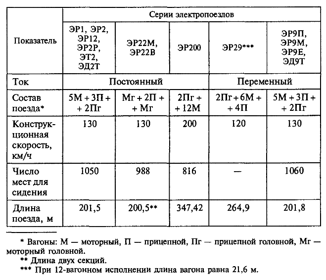 Для пригородного и междугородного пассажирского сообщения на электрифицированных линиях используют электропоезда, состоящие из моторных и прицепных вагонов. В зависимости от пассажиропотоков поезда формируют из 4, 6, 8, 10 или 12 вагонов.