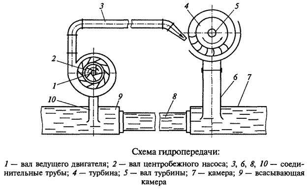 Вал 2 центробежного насоса соединен с валом 1 ведущего двигателя. При работе двигателя насос засасывает жидкость в трубу 10 из камеры 9 и подает ее через направляющий аппарат по трубе 3 к турбине 4, вал 5 которой связан с приводным механизмом. Жидкость из турбины по трубе 6 попадает в камеру 7, которая соединена с всасывающей камерой 9 трубой 8. Из камеры 9 жидкость снова засасывается центробежным насосом и повторяет описанный выше путь. В гидромуфте или гидротрансформаторе насосное колесо приводится во вращательное движение с помощью вала дизеля, а турбинное колесо вращается за счет энергии потока рабочей жидкости, нагнетаемой рабочим колесом.