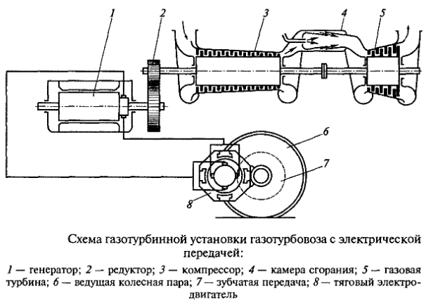 Принцип действия газотурбинной установки газотурбовоза с электрической передачей пояснен на рисунке. Воздух, сжатый в осевом компрессоре 3 до давления 600 кПа, поступает в камеру сгорания 4, где сжигается жидкое топливо. Продукты сгорания при температуре до 730 °С поступают на лопатки газовой турбины 5. Вырабатываемая мощность за вычетом мощности, потребляемой компрессором, передается генератору 1.