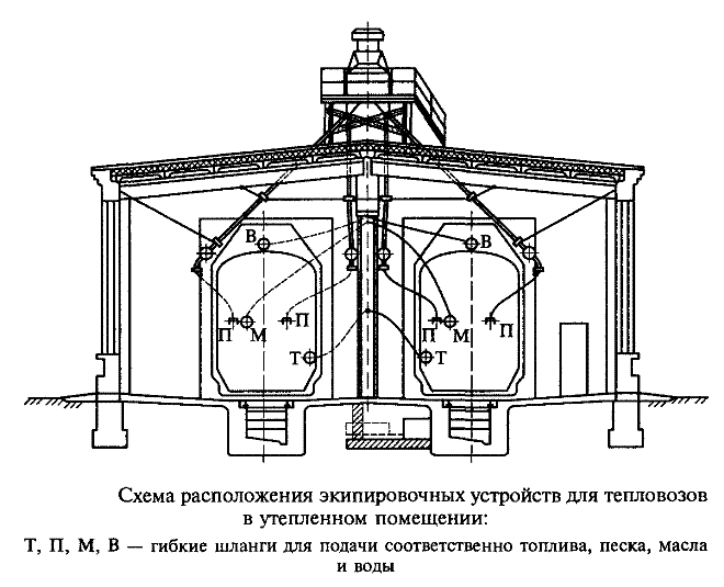 Пробег электровоза и тепловоза между экипировками ограничивается запасом песка и топлива. Локомотивы экипируют на специально оборудованных путях или в закрытых экипировочных помещениях. В обоих случаях экипировочные устройства и канавы, оборудованные для осмотра ходовой части локомотива снизу, а для электровозов — и специальные площадки, предназначенные для осмотра токоприемников, располагаются таким образом, чтобы можно было совместить выполнение всех операций во времени (кроме экипировки песком). На рисунке представлена схема расположения устройств для проведения экипировки тепловозов, совмещенной с техническим осмотром.