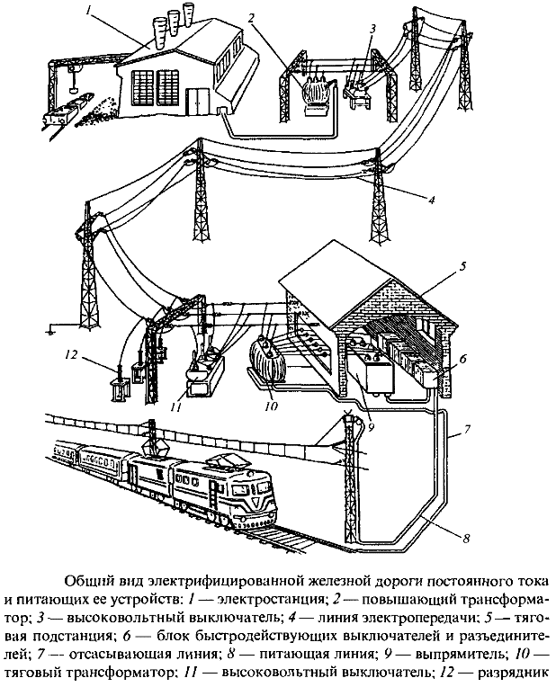 На железных дорогах, электрифицированных на постоянном токе, тяговые подстанции выполняют две функции: понижают напряжение подводимого трехфазного тока и преобразуют его в постоянный. Все оборудование, подающее переменный ток, размещается на открытых площадках, а выпрямители и вспомогательные агрегаты — в закрытых помещениях. От тяговых подстанций электроэнергия поступает в контактную сеть по питающей линии — фидеру.
